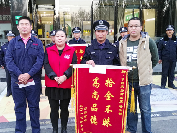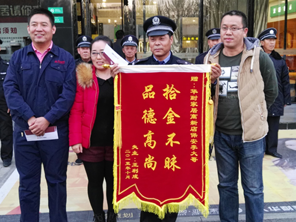 2015年10月23日18是許,保安李明寶在當日營業結束清場檢查時,在張家口華耐高新店商場南區3層衛生間撿到1只皮挎包,立即教到物業部值班室,經值班人員共同檢查,內有包括汽車鑰匙、多張信用卡、駕駛證等物品。19時30分,失主前來尋找。次日上午,為感謝李明寶,失主專程送來“拾金不昧,品德高尚”錦旗一面。